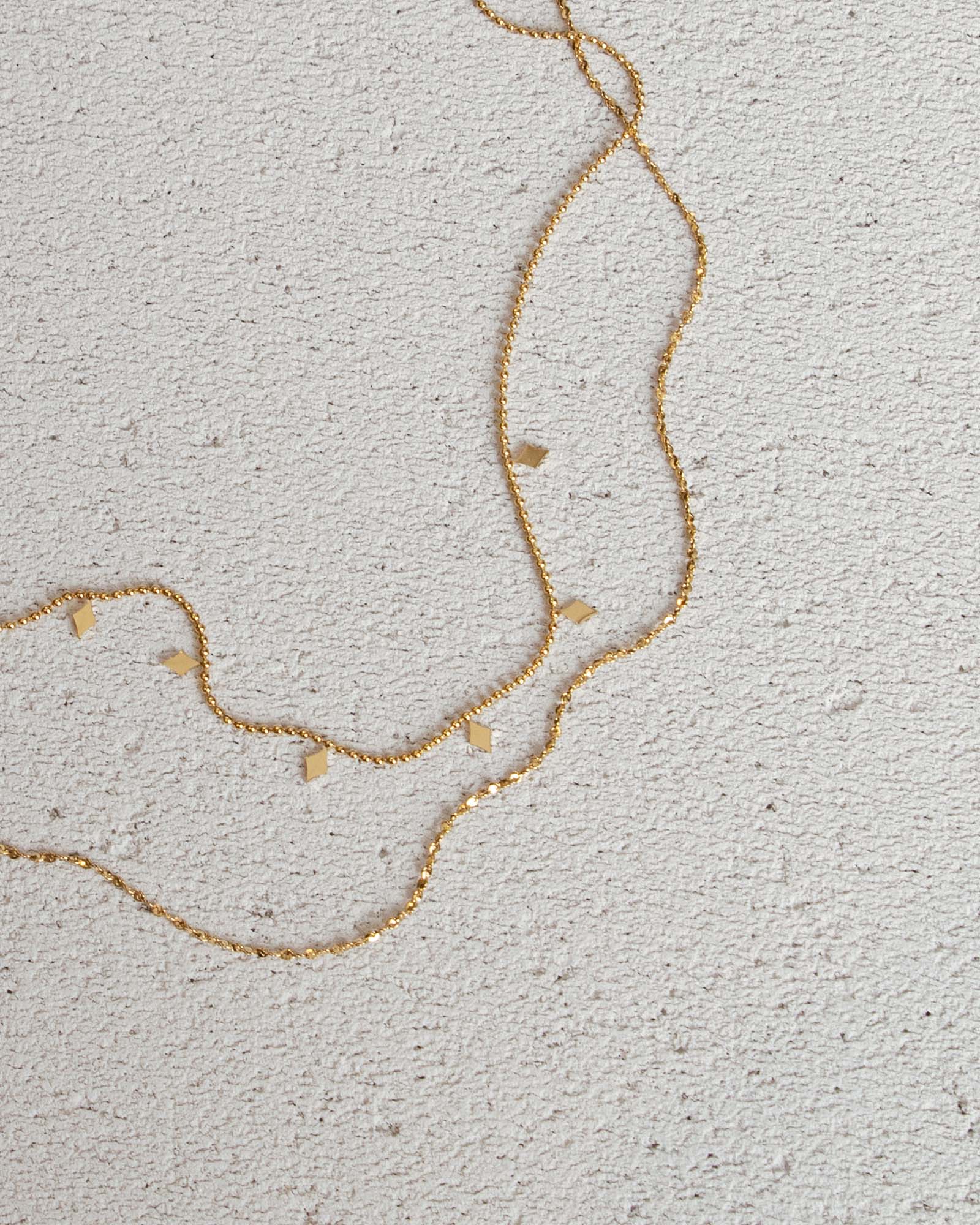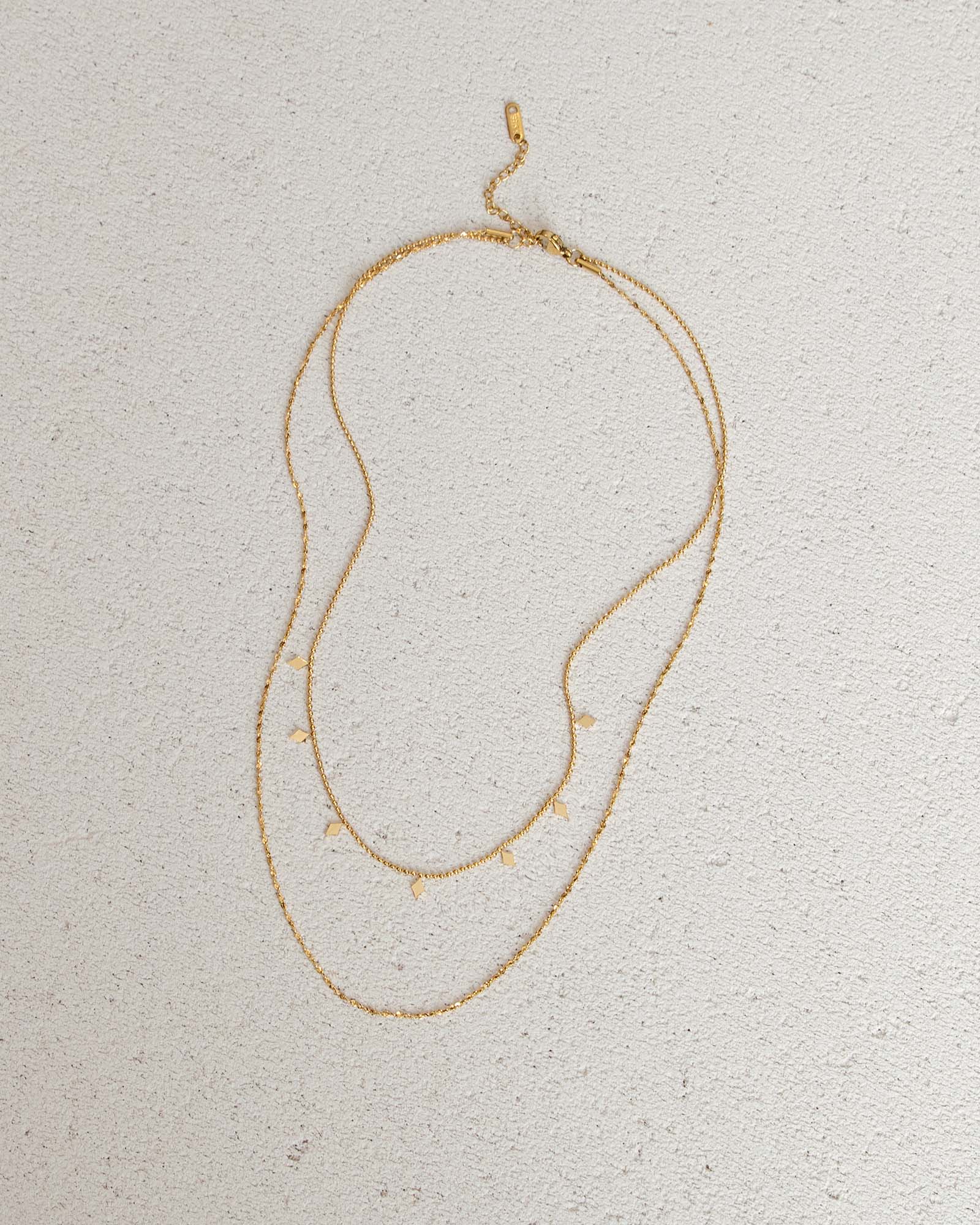 Dante, collier double rang doré est composé d'une petite chaîne ornée de losanges et d'une seconde chaîne à facettes qui reflète la lumière, ajoutant une touche de brillance et de sophistication.